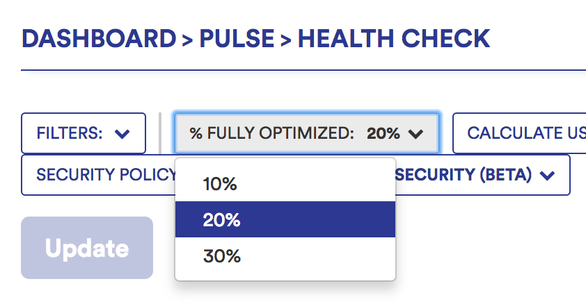 In the Health Check Report, what does the % Fully Optimized filter signify?