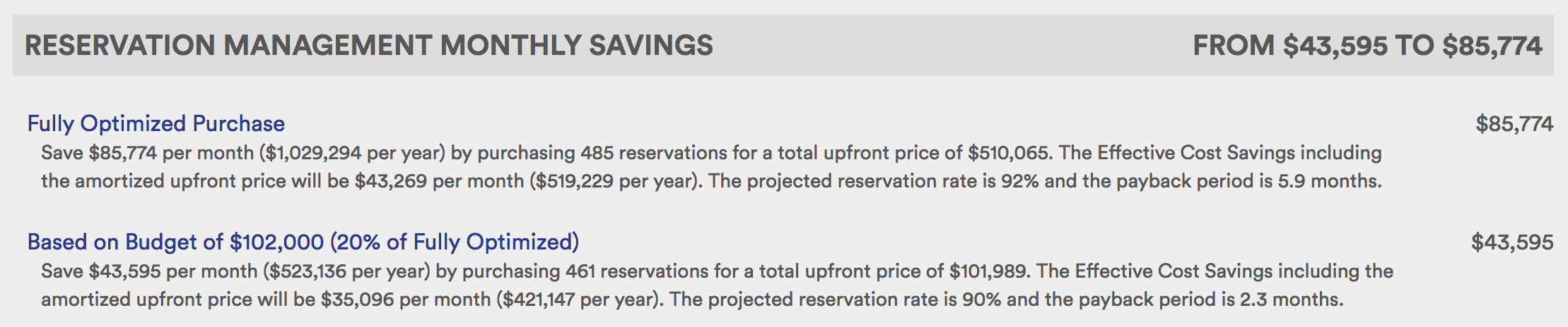 CloudHealth scans your infrastructure to determine your on-demand EC2 usage and then recommends the optimal up-front reservation purchase to cover that usage. But because of budgeting constraints, not all businesses can make the fully optimized upfront payment.