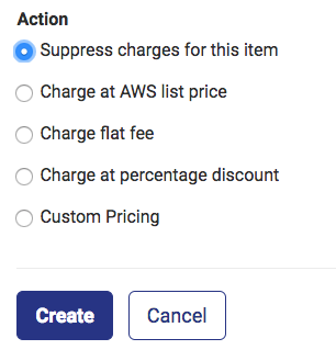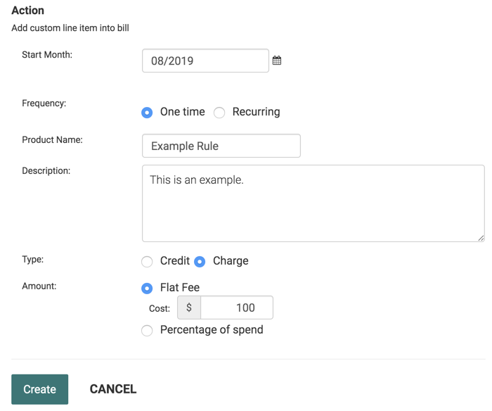 Select an Amount. In the case of Flat Fee, the Product name, Description, and cost are entered as a line item in the bill. In the case of Percentage of spend, the specified percentage (markup or discount) is applied to each line item.