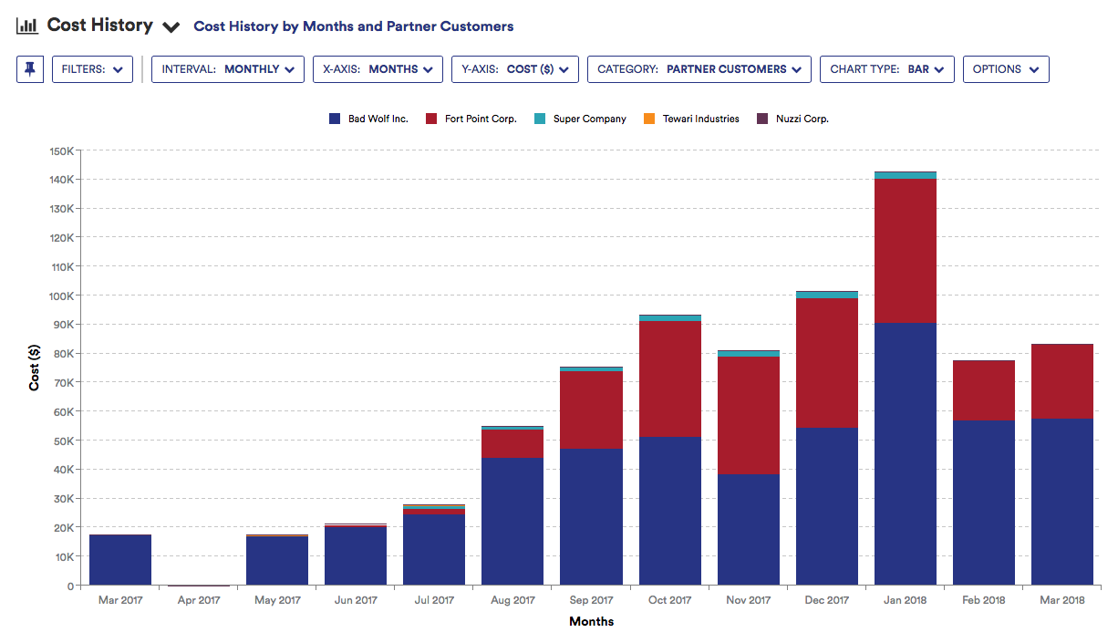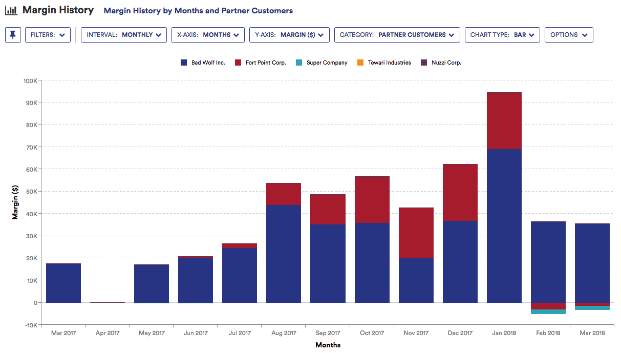 The Margin ($) in the Y-Axis represents the difference of the Cost ($), or the customer billed amount, and the Partner Cost ($), or the partner billed amount. Refer to the Cost History Partner Customer Report for more information on Cost ($) and Partner Cost ($).