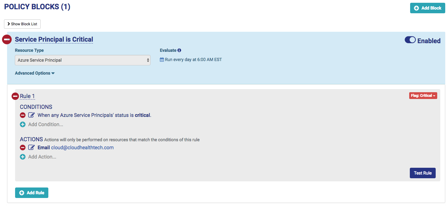 Sample Critical Service Principals Policy: This policy identifies when service principals are at a status of critical and sends a notification to a user.