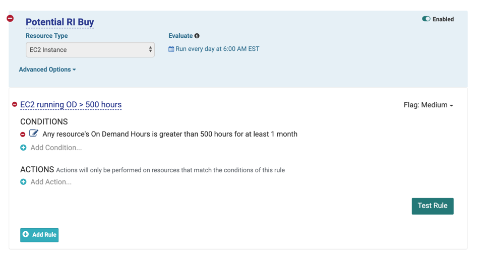 Sample Identified RI Purchase policy: Policy monitors your month-to-date on-demand usage to see if there is an opportunity to reduce your AWS cost by purchasing Reserved Instances for one or more EC2 instances.