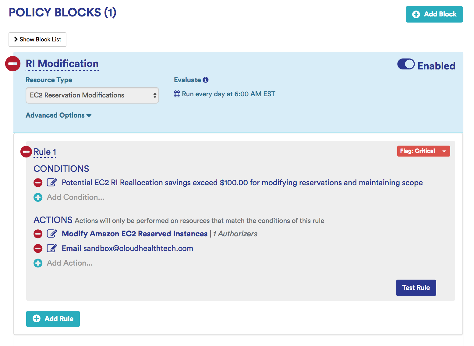 Sample Modify RI Policy: This policy can execute any possible EC2 RI modification when the savings resulting from the modification exceeds a certain ($) amount. This policy will also alert specific users when the RI modification has been executed.