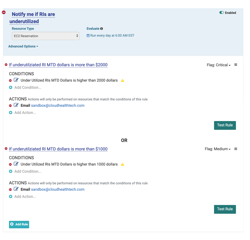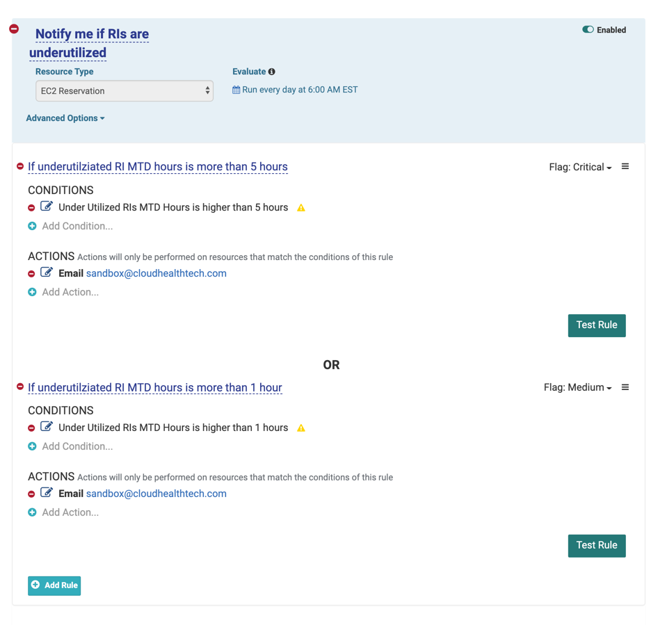 Sample RI Hour Utilization Policy: This policy notifies when RIs are underutilized based on wasted monthly cost. You can create increasing flag levels for the notifications before taking action.