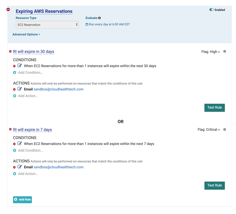 Sample Expiring RI Policy: Expiring Reservations in 60 days, high alert. Expiring Reservations in 30 days, critical alert.