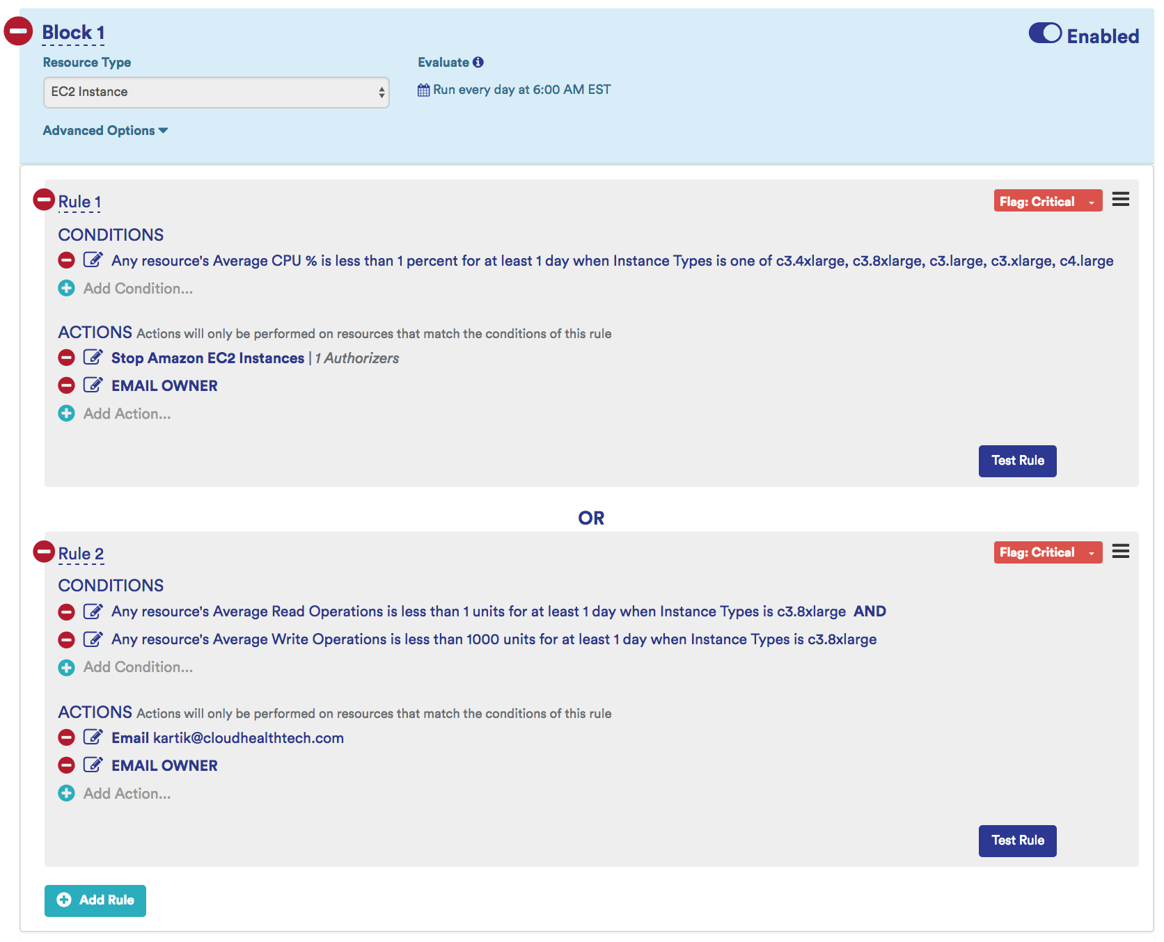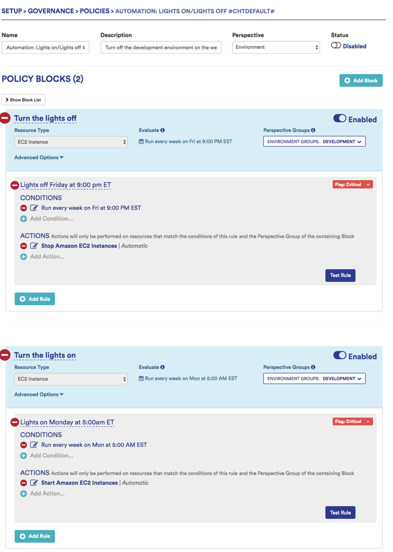 These two rules would evaluate separately. In addition, by leveraging CloudHealth Perspectives, you can run these rules against specific non-production environments.