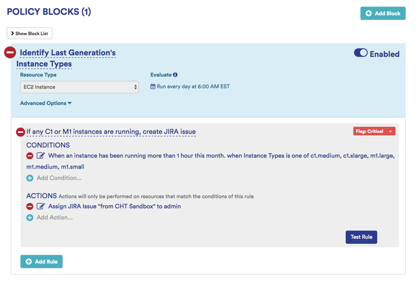 Identify Older Generation Instance Policy: Looks for M1 and C1 instance types with more than 1 hour of runtime in a given month, sends JIRA notification.