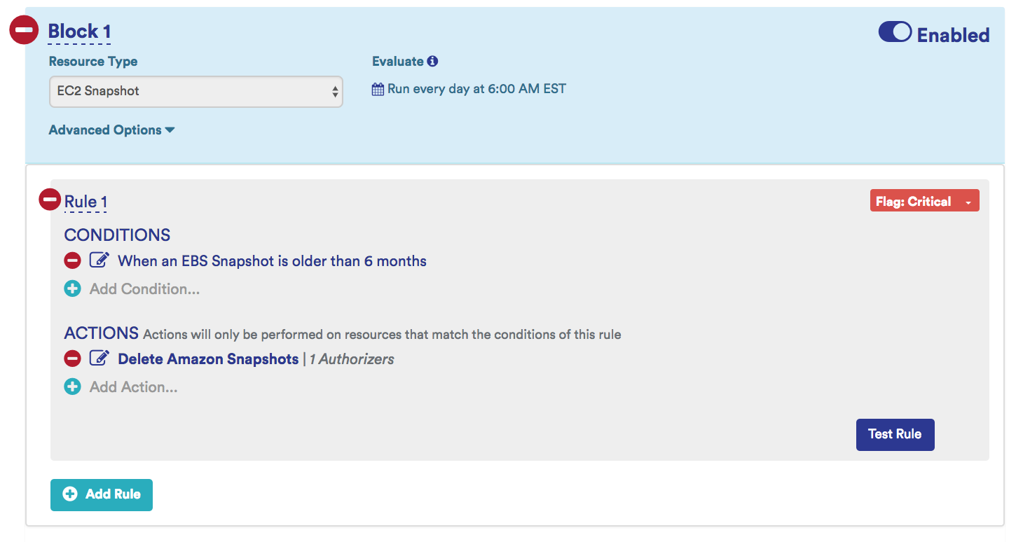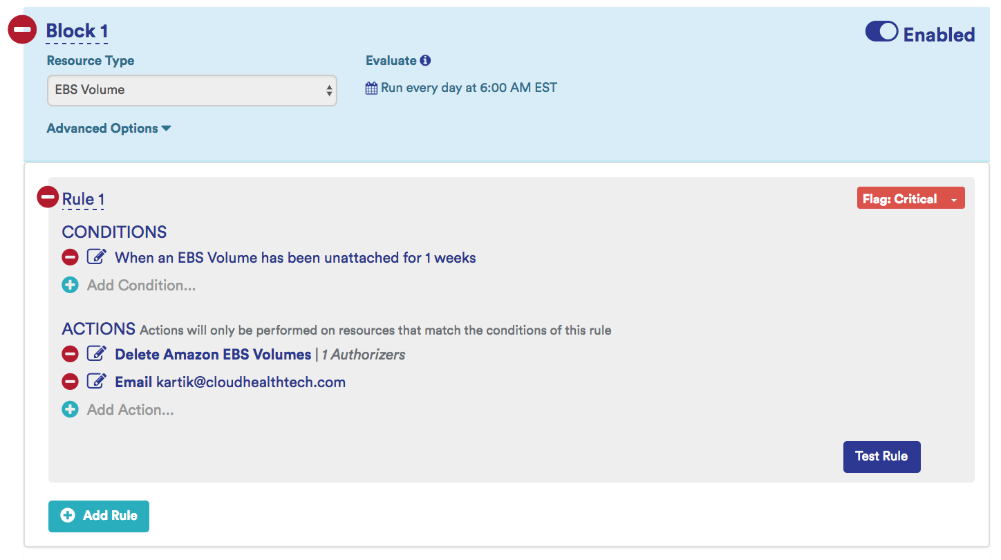 Sample Zombie Volume Identifying Policy: This policy identifies attached but potentially unused EBS volumes and terminates them.