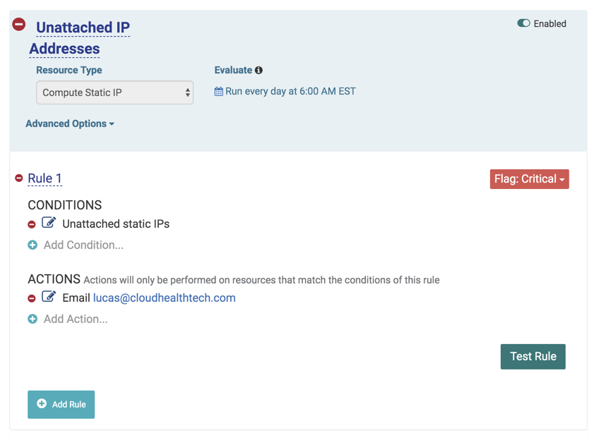 Sample Release Unattached Static IP Identifying Policy: This policy identifies unattached static IPs and send a notification.