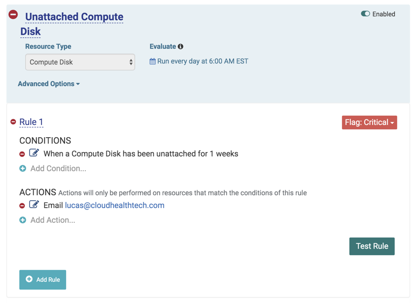 Sample Zombie Compute Disk Identifying Policy: This policy identifies unattached compute disks and sends an email notification to an administrator.