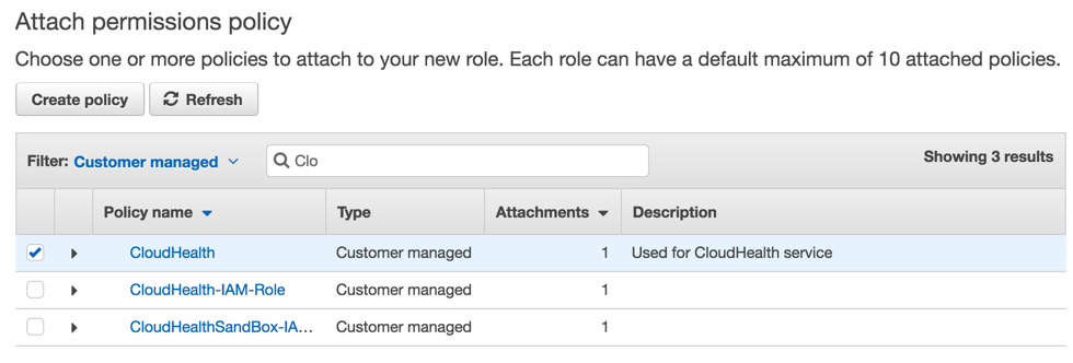 On the Create role > Permissions page, set the Filter field to Customer managed and choose the CloudHealth policy you created.