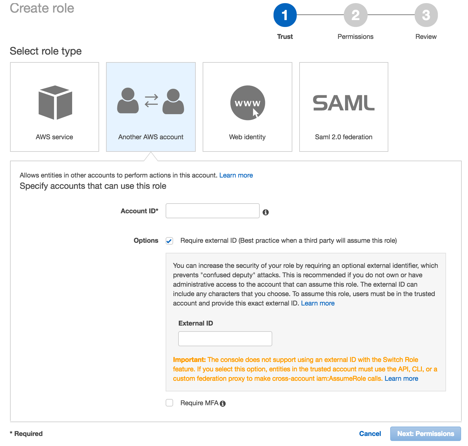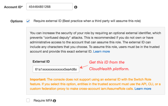 Select option to require an External ID. Copy the External ID that CloudHealth generated for you in the Account Setup form. This ID is unique for each CloudHealth customer, so you can reuse it across all your accounts. Paste this ID in the External ID field in the AWS Console.