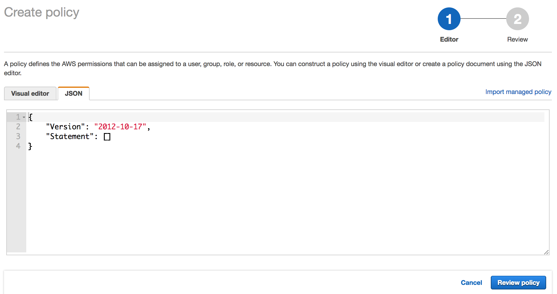 Return to the AWS Console and paste the policy in the JSON tab. Then click Review Policy.