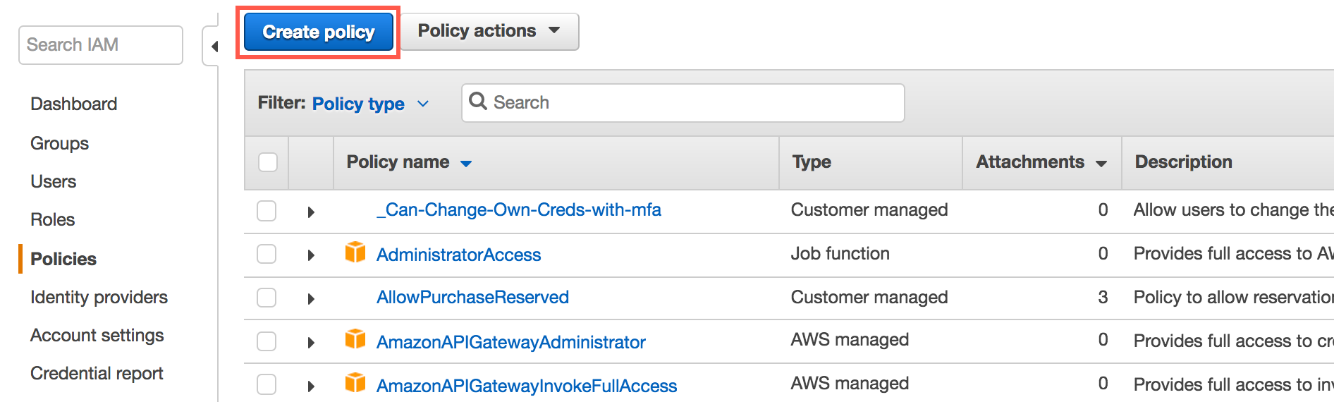 Navigate to Services > IAM. From the left menu, select Policies and click Create Policy.