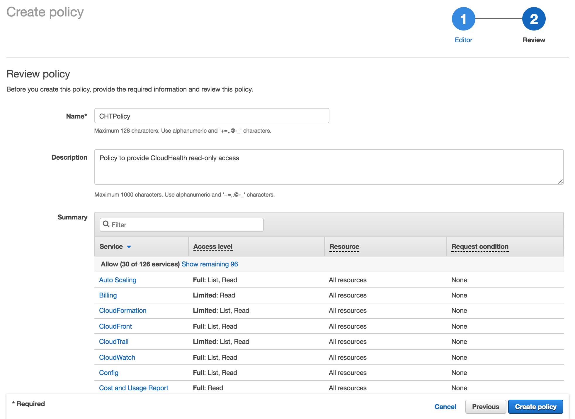 Name the policy (e.g., CHTPolicy), provide a description, and click Create policy.