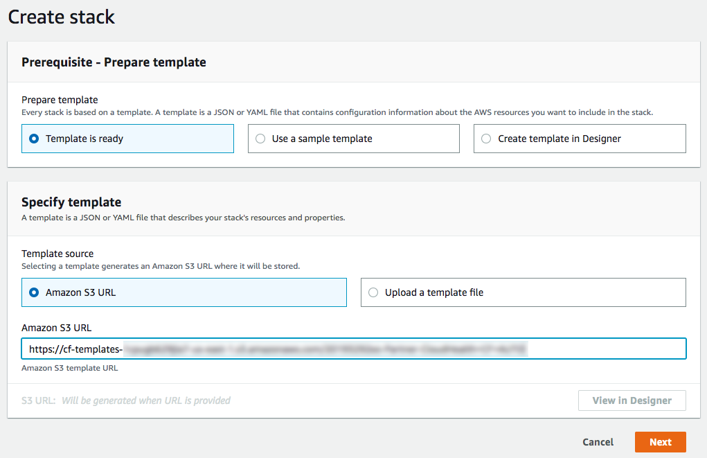 Under Choose a template, select the Specify an Amazon S3 template URL. Enter the link you copied in step 2 and click Next.