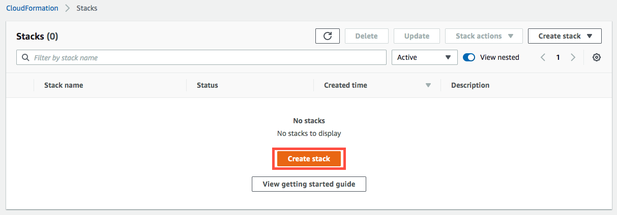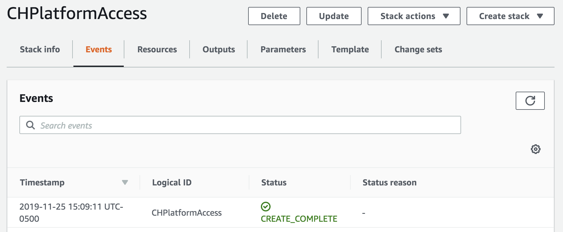Verify that the newly created stack reaches a status of Create_Complete. This process should take less than a minute.